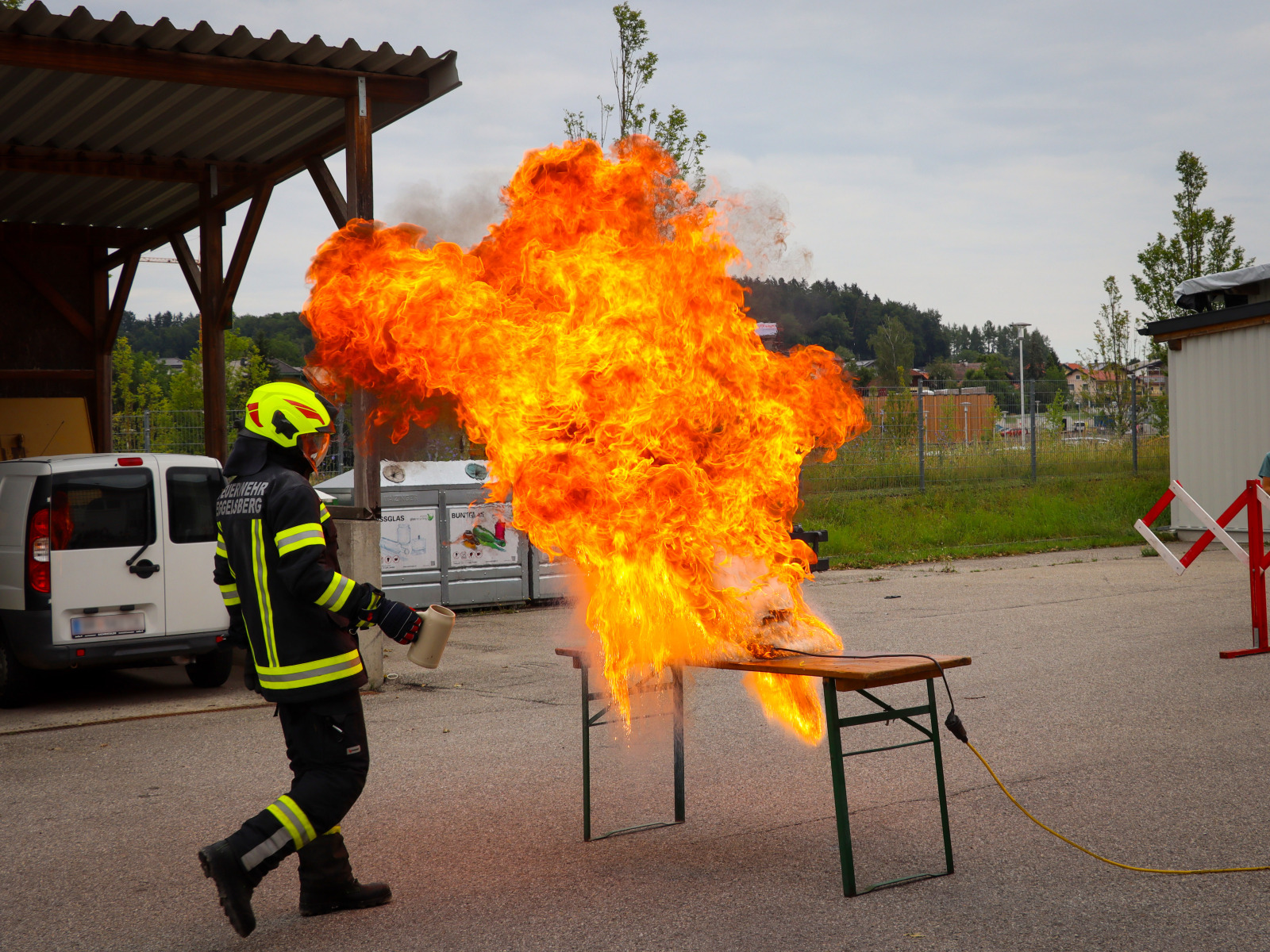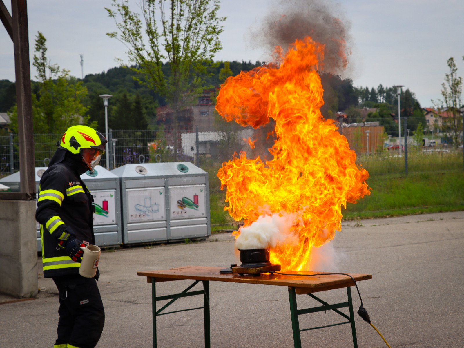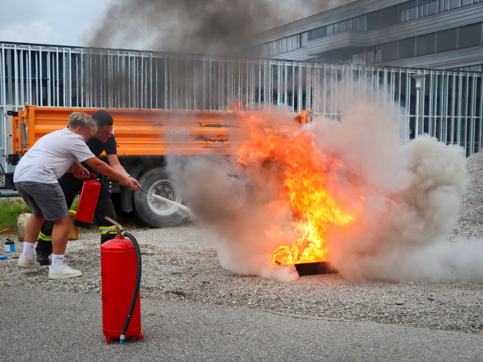 Im Stationsbetrieb konnten die Jugendlichen viele spannende Dinge über die Feuerwehr kennenlernen. Neben dem klassischen Löschangriff konnte auch das hydraulische Rettungsgerät probiert oder einmal eine volle Atemschutzmontur getragen werden. Die Einsatzfahrzeuge durften besichtigt oder auch die Wärmebildkamera getestet werden. Auch der sichere Umgang mit dem Feuerlöscher und das richtige Verhalten im Brandfall wurde trainiert. Highlight war wie jedes Jahr die Aussicht von ganz oben am Teleskoplader zu genießen. Zum Abschluss wurde noch ein Fettbrand simuliert, um die Auswirkungen von Wasser als Löschmittel zu zeigen.